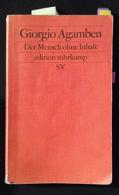 Das Buch von Giorgio Agamben ist bereits älter, die italienische Ausgabe L’uomo senza contenuto ist schon 1970 erschienen, die deutsche Übersetzung allerdings erst letztes Jahr, 2012, das heißt mehr als vierzig Jahre später. Agamben ist als Denker in der zeitgenössischen Theoriediskussion sehr präsent, das mag den Verlag bewogen haben, die Schrift so lange nach ihrem ersten Erscheinen schließlich auch auf Deutsch herauszubringen. In den späten neunzehnhundertsechziger Jahren hat Giorgio Agamben an Martin Heideggers Seminaren im südfranzösischen Le Thor teilgenommen, das ist dem Buch streckenweise deutlich anzumerken.